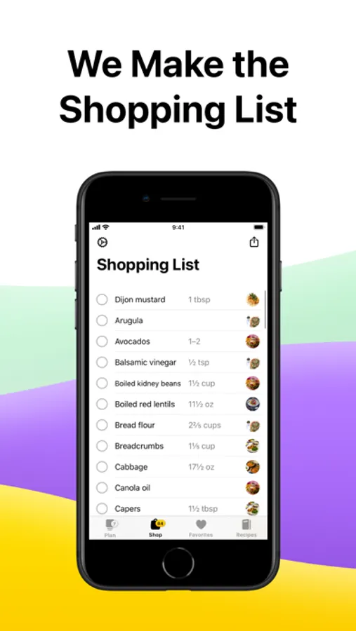 • Grocery Shopping List. We make the shopping list for you, with all the grocery items you’ll need when cooking.
