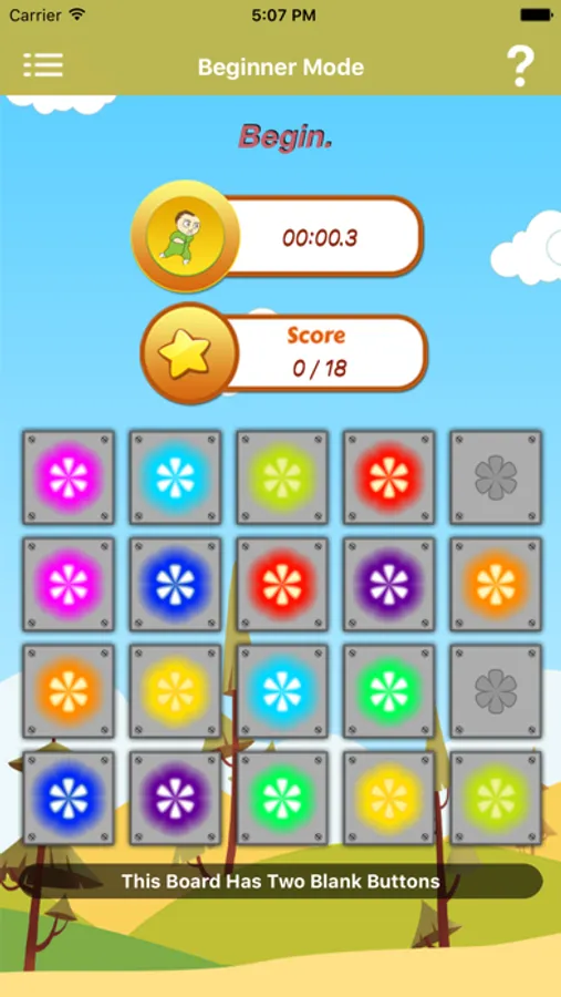 Beginner Mode: In this mode, buttons of the same color have to be matched against a timer clock.This mode has 2 blank buttons which have no color in them and cannot be selected.
