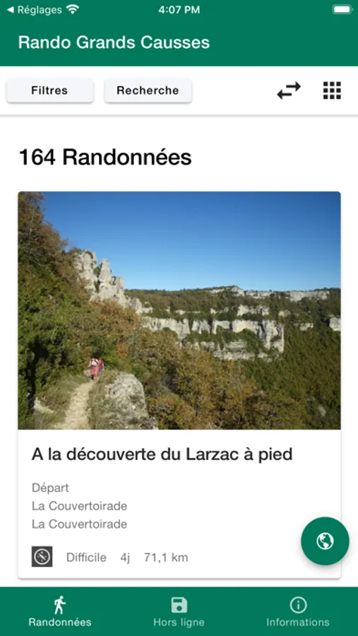 Consultez et téléchargez les fiches de randonnées avec leurs points d’intérêt et leurs photos. Choisissez et embarquez vos itinéraires de randonnées pour les visionner hors connexion et naviguez en utilisant le GPS de l’appareil.