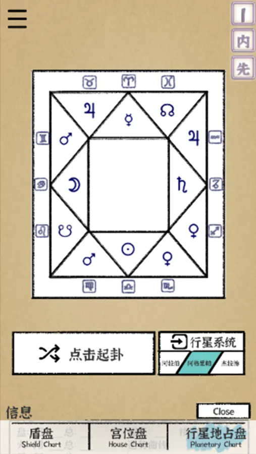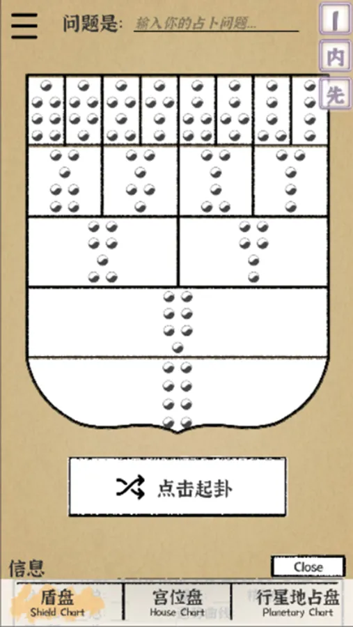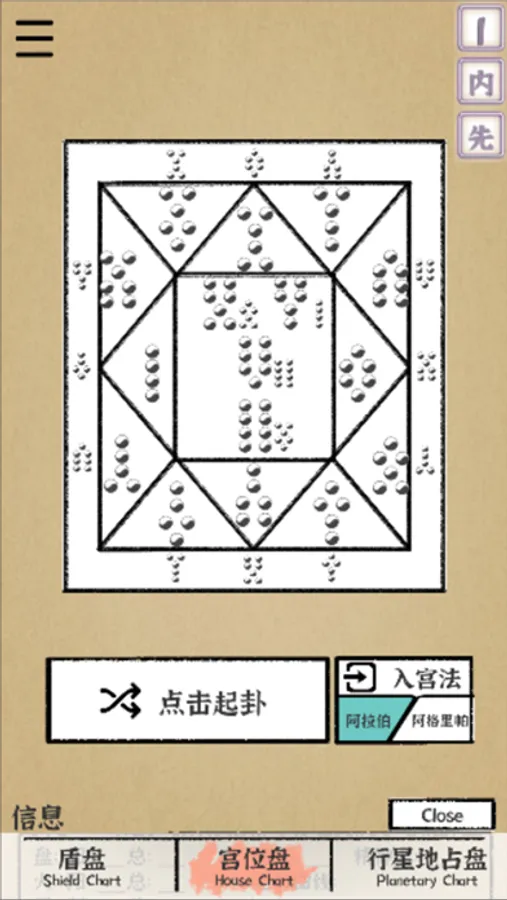 地占术(Geo-mancy),Geo-前缀“地面的”,-mancy后缀“占卜”,意为在地面上的占卜,常用石头摆放丶泥土和沙子上画出来,最典型的方法就是用十六卦来分析,也可以把十六卦套入星盘中解读。