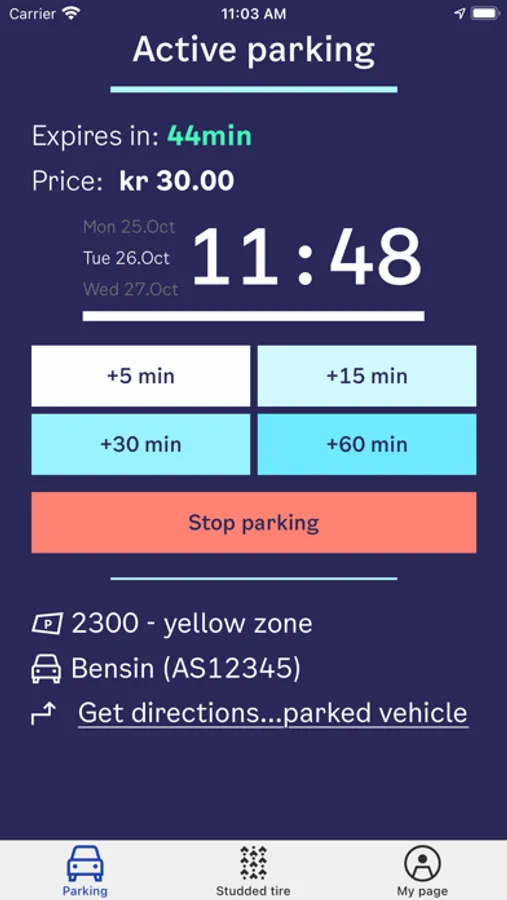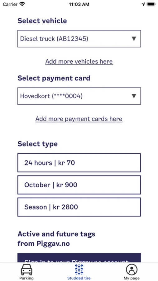 You can pay the daily, monthly and seasonal studded tire fee in the app. The daily fee is valid for 24 hours and the monthly fee is valid for the current month. The seasonal fee can be canceled and you are refunded for the remaining period of the season.