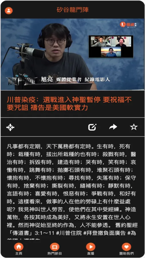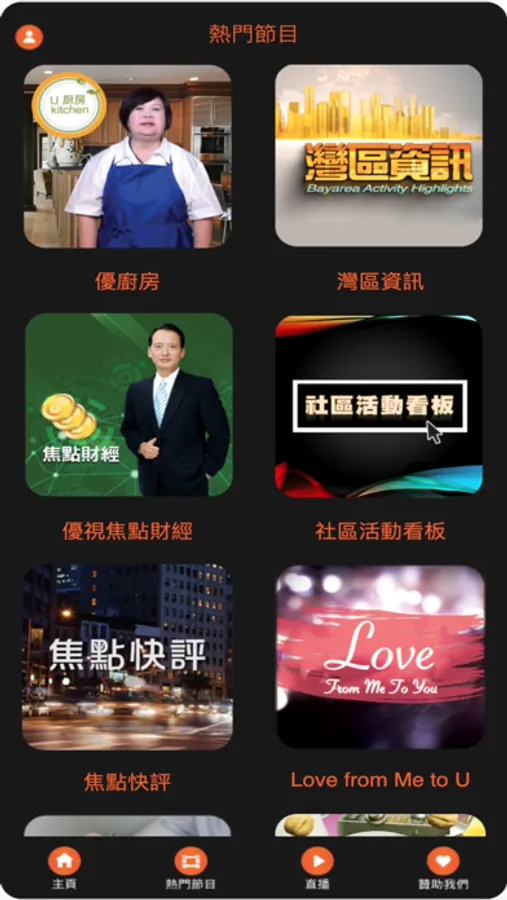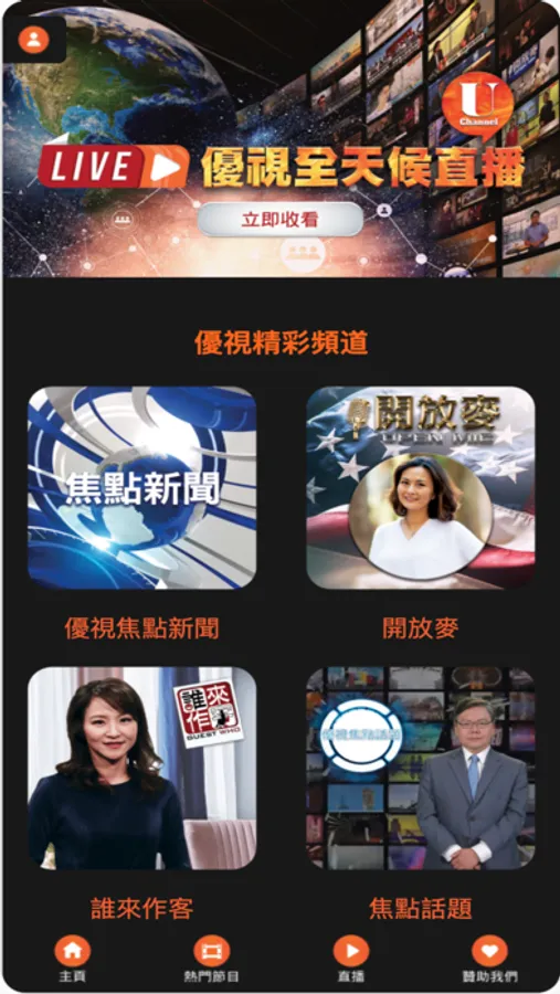 UChannel TV,全美#1華人公益、全方位生活頻道,灣區唯一全時段免費提供中文節目的電視台,您的中文影視播放器。 UChannel TV優視頻道,2013年成立於北美Santa Clara,CA,是加州政府和美國IRS 501(c)(3) 立案的非牟利、公益服務機構。 優視頻道通過視頻節目進入家庭,走入生活,宣揚正面、積極、善良文化,改善家庭、親子、職場關係及人生價值觀,服務社區。 評論訪談 《焦點話題》:追蹤最新動態,關注新聞焦點,解析話題觀念,深入淺出歸納分析,解讀媒體報導背後意義 《開放麥》:美國製作唯一華人政治脫口秀。以華人視角審視美國主流政治動態,傾聽華裔社區不同聲音,解讀不同面向 《財經趨勢》:全球經濟瞬息萬變,專家團隊精心製作與你切身相關財經節目,輕輕鬆鬆看懂股票市場,掌握先機 《矽谷龍門陣》:剖析時代最前端,最火爆科技人文話題,融入人生智慧和洞見,擴展社會和人性層面 《名人訪談》:專訪政經、藝文、公益領域名人,以非報導性角度探索名人內心世界,分享生命故事 新聞資訊 《焦點新聞》:每週五天,報導全球熱門焦點新聞 ,掌握華人關心話題與時事脈動,中國、台灣、香港、美國信息全網絡 《焦點財經》:每週三、五,你給我三分鐘,我給你全球最新財經情勢,股市訊息不漏接 《灣區資訊》:現場採訪即時報導,提供灣區最新政經藝文與社團活動資訊 《社區看板》:每週刊登灣區社區藝文休閒、教育文化、社區公益活動資訊 《熱門話題》:家事國事天下事,事事關心;大事小事社區事,事事掌握,就在熱門話題 生活藝文 原創紀錄片:以華人的視角觀察拍攝生活周邊社區的人文、公益與生命故事。認識社區,關心公益,生命成長 《你不知道的矽谷》:講述矽谷生活工作芸芸眾生的故事,觸摸生命的溫度,拒絕機器的冰冷 《誰來作客》:以客為尊為主訪談性節目。依據嘉賓的角色與專長,分享傳遞個人經驗和看法 《轉捩點》:資深顧問學者專家,提供有關家庭婚姻、親子教育,以及職場工作各方面的教導與學習資訊 美食系列 《優廚房:》星馬泰系列主廚Cindy以特色辛香料理食材,簡單示範易學易懂,輕鬆上手變主廚 《優美食》:國際電視名廚甄文達(Martin Yan)等主廚,親自示範製作營養均衡,美味健康料理 《舞動酒香》:專業藍帶主廚侍酒師廖若庭(Miggi),邀請嘉賓談生活情趣、介紹示範好酒配好菜頂級料理 優系列 《優百科》:生活小百科,行家一出手,就知有沒有。專家上節目,分享各行各業專業知識與訊息 《優健康》:優質華人健康管理節目。邀請醫護組織和專科醫生,提供華人醫療保健與健康管理訊息 《優音樂》:重溫經典,紀錄時代,點燃熱情,守望夢想。透過音樂帶來心靈慰藉與啟發 《優旅遊》:介紹各地美景特色、文化風俗,趣味亮點,提供全家最優質的旅遊好去處