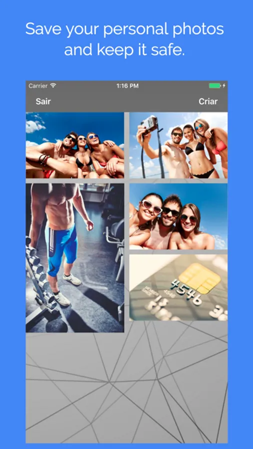 Para logar no app você usa o TouchID (o leitor de impressão digital) do seu dispositivo. O App criptografa todas as imagens que são colocadas dentro dele, mas o que isso significa? Isso significa que qualquer imagem que você colocar dentro do app, ele vai transformá-la em um monte de números que não vai fazer sentido se alguém ou algo conseguir ter acesso à memória do seu celular.
