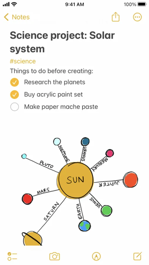 Notes is the best place to jot down quick thoughts or to save longer notes filled with checklists, images, web links, scanned documents, handwritten notes, or sketches. And with iCloud, it's easy to keep all your devices in sync, so you’ll always have your notes with you.