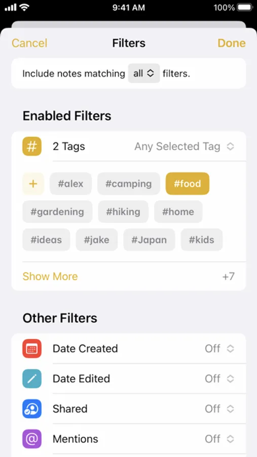 • Automatically organize notes in a Smart Folder based on filters. Create rules to filter for Date Created, Checklists, Attachments, and more.
