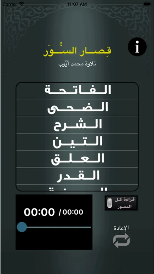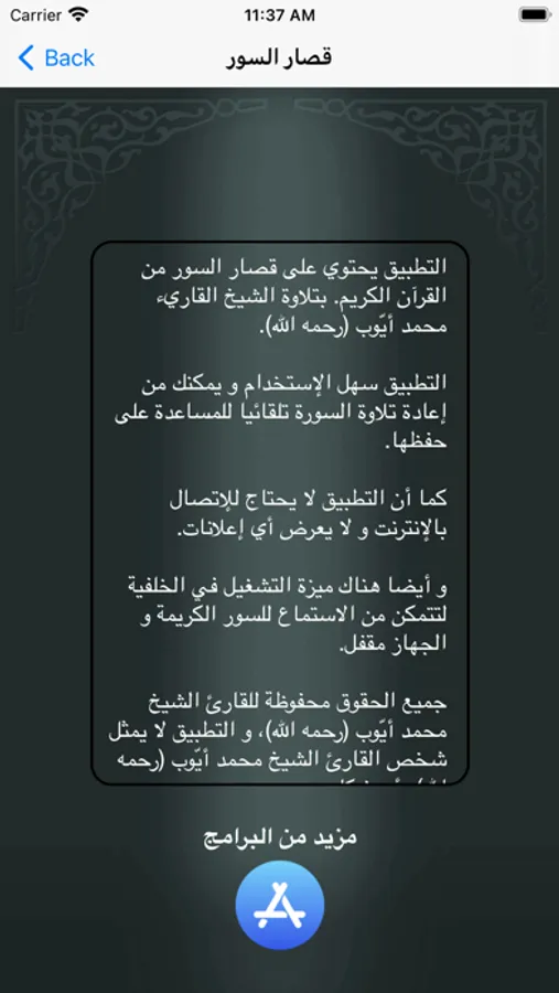 التطبيق يحتوي على قصار السور من القرآن الكريم. بتلاوة الشيخ القاريء محمد أيوب (رحمه الله).