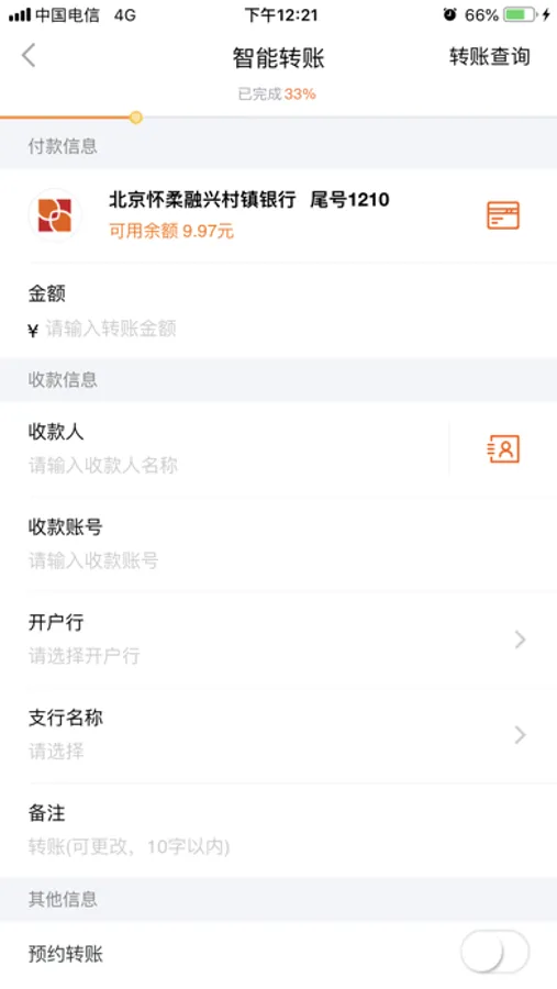 智能转账:包括同名转账、行内转账、村行互转、村行转哈行(对私)、大小额汇兑。