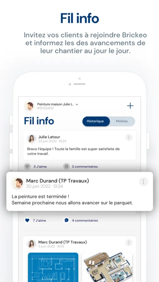 L'app Brickeo Pro vous permet de proposer un suivi régulier et organisé des chantiers en cours, afin de renforcer la communication et votre relation avec vos clients.