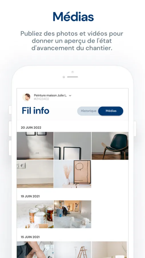 Dans l'onglet Médias, retrouvez facilement pour chaque chantier toutes les photos et vidéos automatiquement ajoutées au jour le jour par l'ensemble des intervenants d’un projet. Plus besoin de chercher dans vos emails ou SMS.