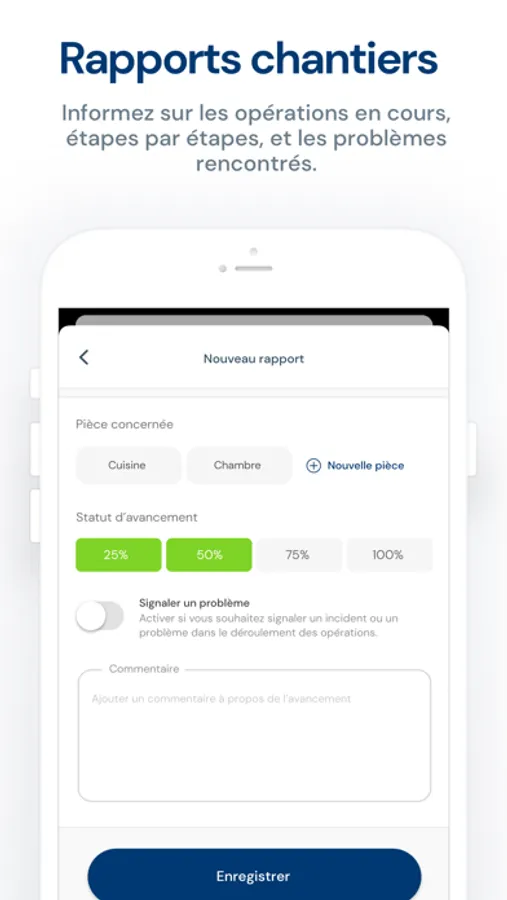Indiquez étape par étape l’état d’avancement des opérations pour chaque pièce. Vous pouvez également signaler un problème et ajouter un commentaire afin d'informer vos clients en toute transparence.