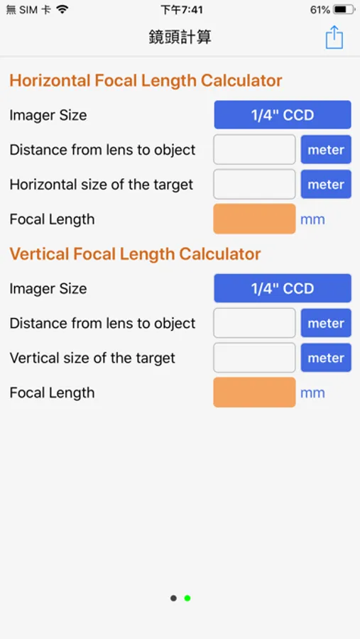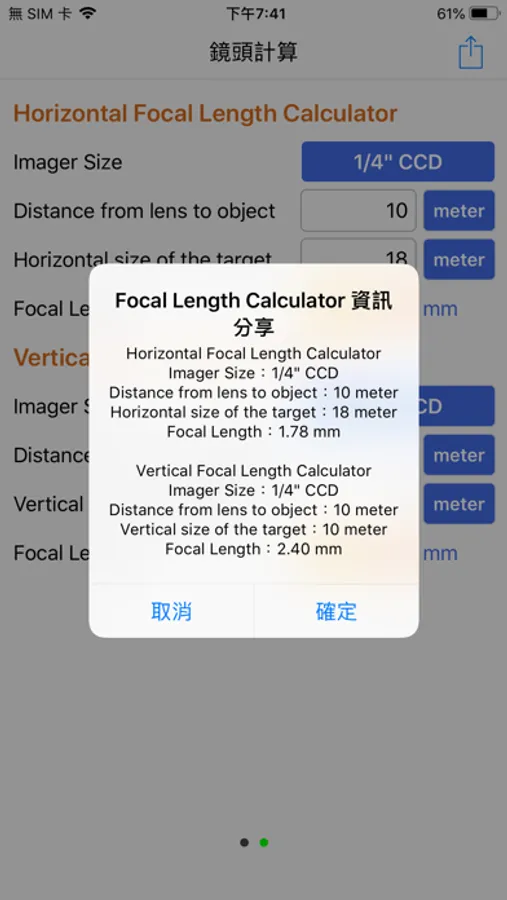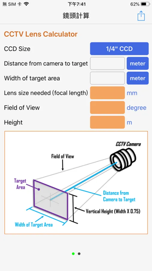 「鏡頭計算」是一款可以進行鏡頭計算及焦距計算兩項功能的APP應用程式。鏡頭計算可以透過鏡頭大小的選取、距離及標的物長度設定,計算得焦距值、視野(Field of View, FOV)及標的區垂直高度。焦距計算則包含了水平焦距計算及垂直焦距計算,透過鏡頭大小的選取、距離及標的區長寬設定,可以計算焦距值。鏡頭大小可以選取七種,分別是:1/4、1/3、1/2.5、1/2、1/1.8、2/3及1英吋。測量單位包含四種,分別是:meter(公尺)、feet(英呎)、inch(英吋)及mm(公厘)。
