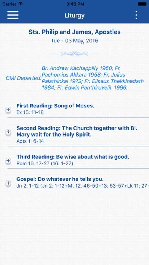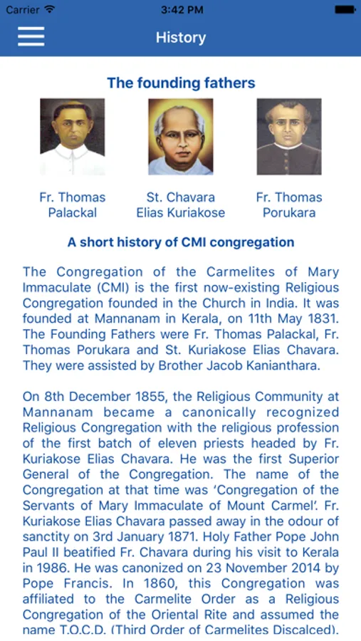 This smartphone app focuses on helping the priest and religious of CMI congregation to follow the daily mass readings according to SyroMalabar Liturgical Calendar on their Smartphones. The departed CMI of the day can also be remembered. This app also works as an interactive searchable Directory of CMI presences around the world integrated with Google map. A brief History of the congregation also included in the app.