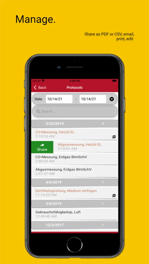 Remote control of MRU Fluegas Monitoring Units via Bluetooth. Transfer to and storage of measured data on Smartphone and Tablet. Data export as CSV file or screenshot as an email attachment.