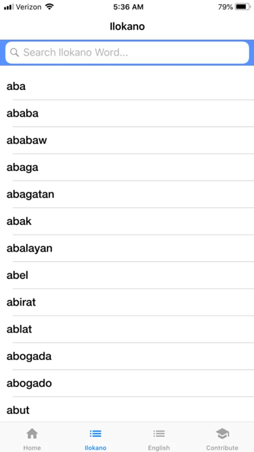 The application allows you to search for Ilokano and English words. Each entry includes the English/Ilokano equivalent of the search term, along with the definition and part of speech. Synonyms, antonyms, example sentences, and other remarks may also be included in an entry.