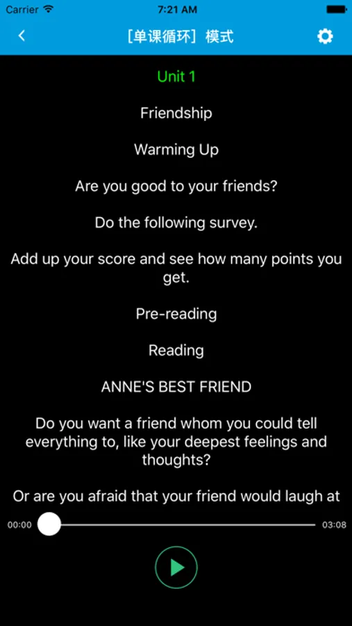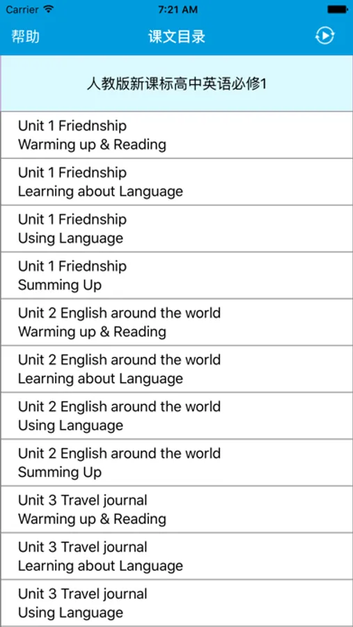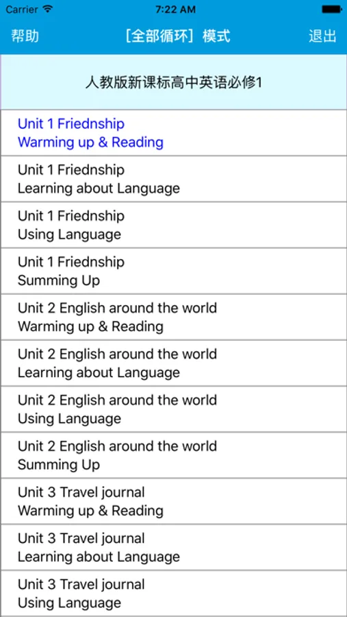 本应用对应人教版新课标高中英语必修1课本,具有跟读模仿,自动听写,变速播放的复读机功能。