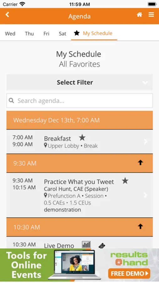 See the live Events currently in the ConferenceBeat app. Browse the event information and set your personal schedule as well as search for friends and colleagues attending the event and add them to your contact list (favs). Find you way around the exhibit hall and the venue with in app maps. Receive up to the minute alerts regarding the event pushed to your Device! Start in current Events and then go to your event to sign in and get started!