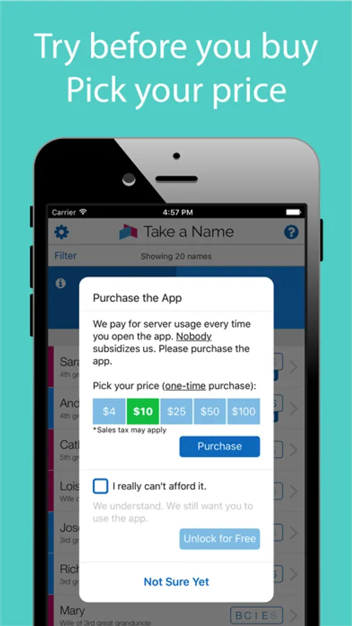 • Try before you buy, pick your price—Try Take a Name for free! You can purchase the app when you're ready via in-app purchase.