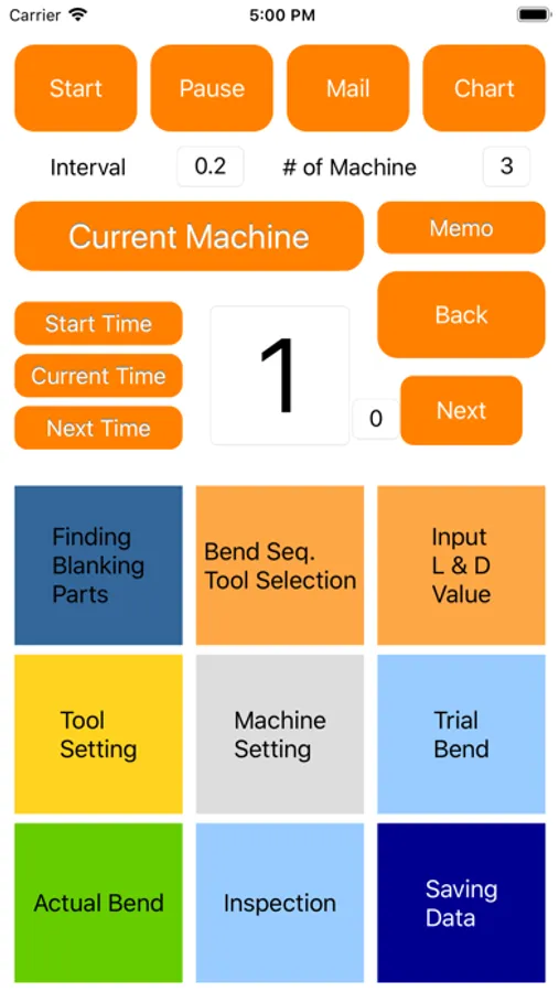 Before start, Set Interval (min), Machine qty., Name and Memo.