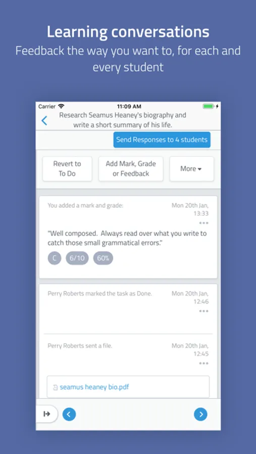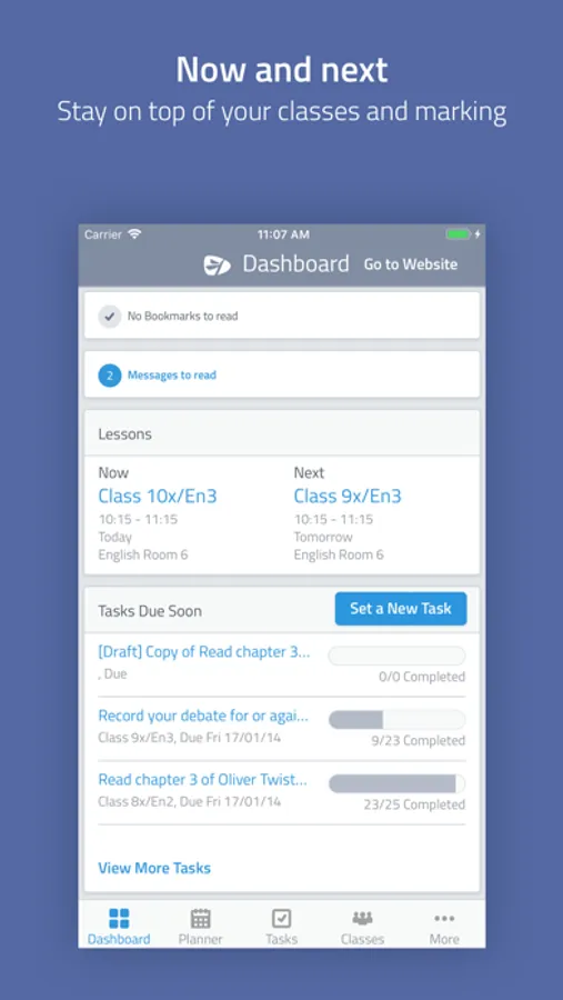 Starting with an overview of your day and any assignments ready for collections, you can quickly and easily plan your lessons, manage homework and provide marks and feedback. The integrated markbook ensures that you can track the progress of each class, and detailed task histories help you understand how best to support each student to help them go even further.