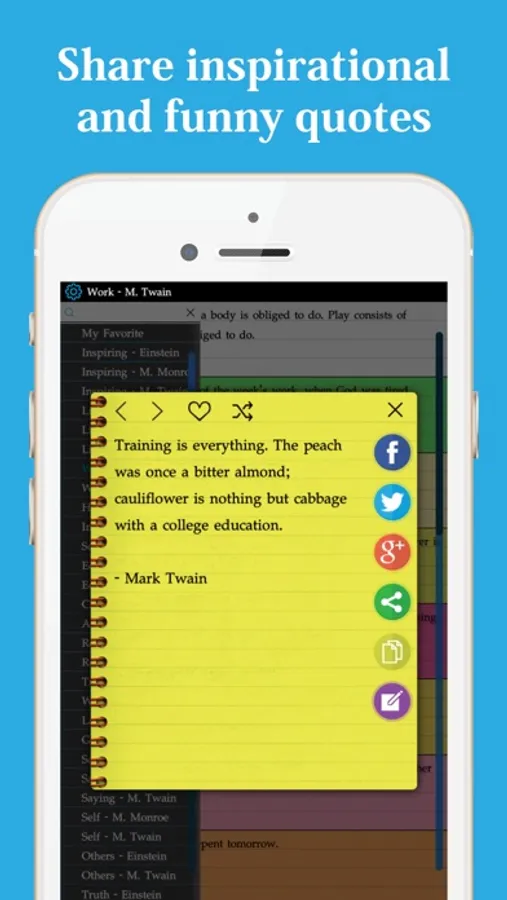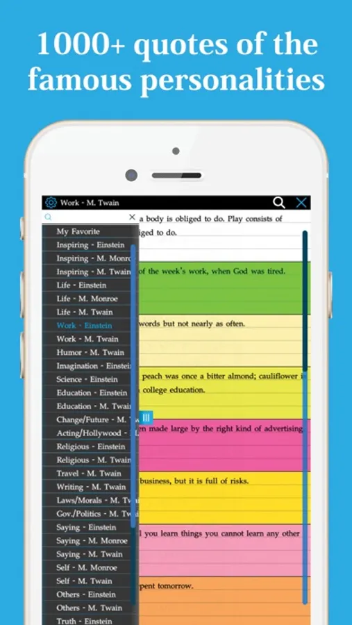 This app contains the best of best quotes from the most influential person who ever walked on earth like Mark Twain, Marilyn monroe, Albert Einstein. Their quotes not only inspire you but also bring smile on your face and in your life.