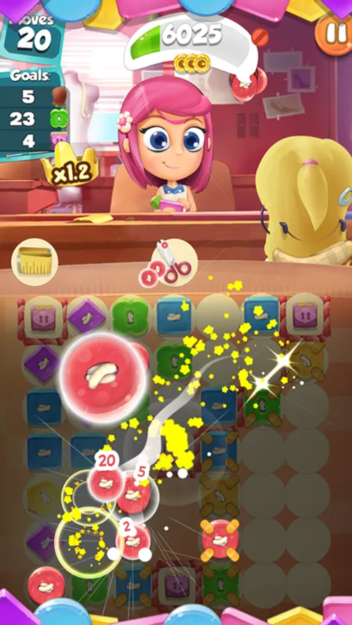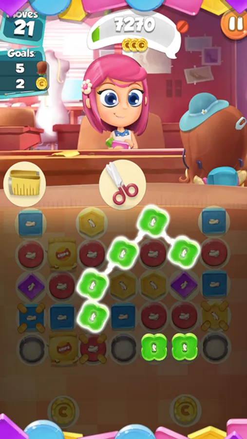 * For all fans of “match three” games! “Buttons and scissors game” is exactly what you're looking for to while away your free time and sharpen your thinking skills. Easy and fun to play, challenging to master, definitely one of the most exciting “match 3 games free with bonuses”. Cut off buttons, make chains to pass levels, buy balloons and save coins for Rosie's sewing store. Become part of the legendary fashion story in one of the “latest match 3 games” free.