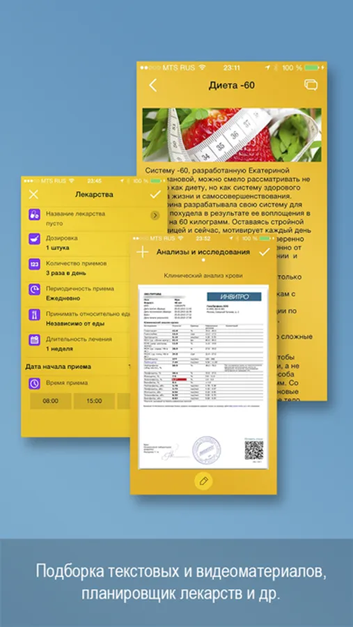 - Специальный планировщик приема лекарств, который интегрирован в дневник, поможет Вам легко сформировать график их приема на каждый день.