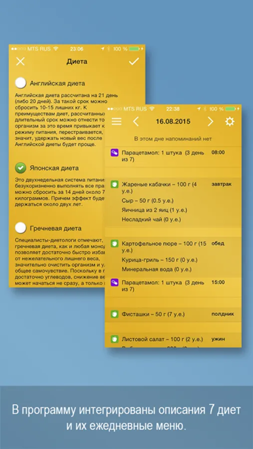 - Если отметить в программе начало одной из семи вариантов диет, то программа начнет отображать ежедневное меню этой диеты в разделе Расписание на день