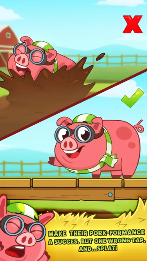 Tap to remove a growing number of stacked objects — from bales of hay to purple elephants to ice cream sundaes — and land Adventure Pig on the platform in style. One wrong tap, and — SPLAT! — your act ends in the muck.