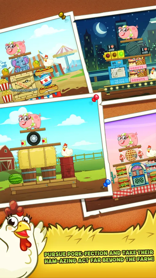• Pursue pork-fection across 40 levels starting at the farm and continuing on to a diner, a carnival, and a big city!