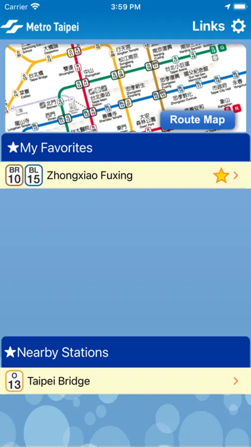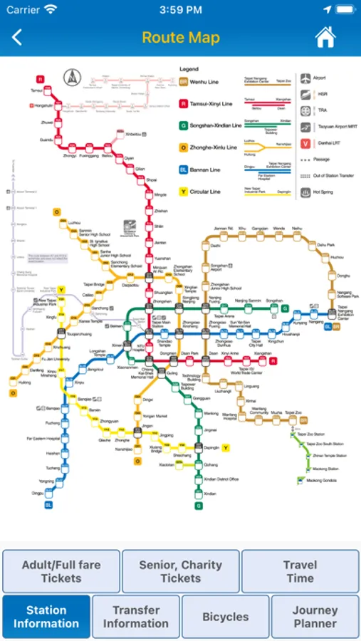 The app provides a Taipei Metro route map, station exit information, transfer information and a journey planner. The interface launches on the Metro map, from where you can click into the station you wish to look up.