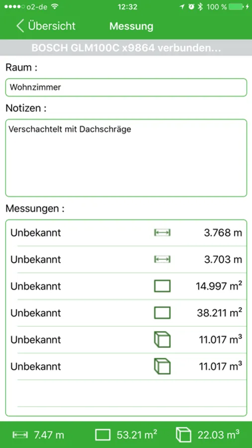 Es werden die Geräte Bosch GLM50C, GLM100C, PLR30C, PLR40C und PLR50C unterstützt. Dabei werden die folgenden Messungen direkt von den Laserentfernungsmessern an das iPhone oder iPad übertragen :