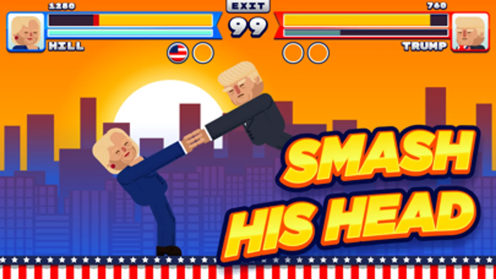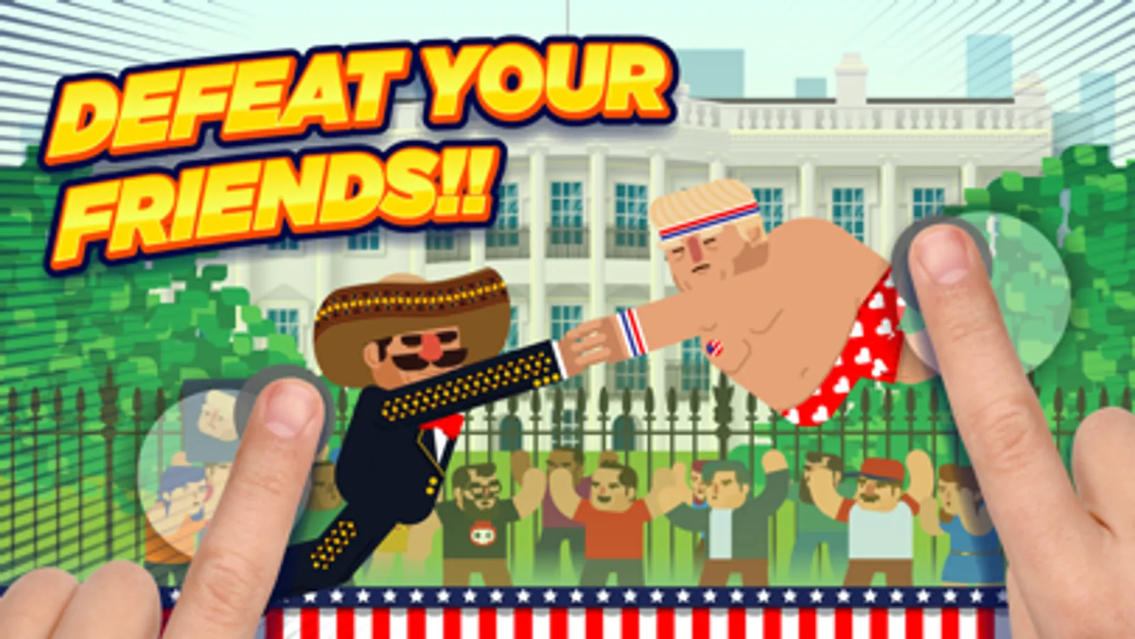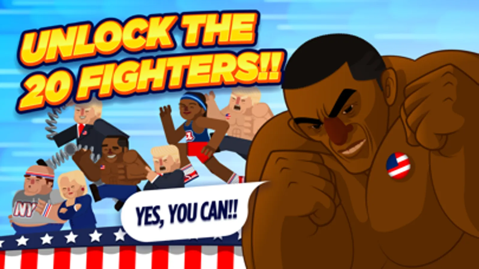 Are you a democrat or a republican? It doesn’t matter! Fight with or against Donald Trump or one of its many versions, or choose Barack Obama, Hillary Clinton, Johnson the rapper, Clovin the Irishman, Frank the obese, Pancho the Mexican mariachi… And so on up to 20 powerful fighters. Will you be able to unlock them all?