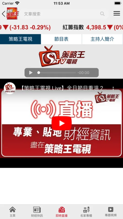 《策略王電視》由2017年4月份開始在港股交易日,每天朝9晚6直播財經節目,直播節目透過網絡平台如港股策略王官方網站、港股策略王手機應用程式、港股策略王Facebook 以及 YouTube 播放視像直播而港股策略王官方網站及手機應用程式更支援聲音直播頻道。《策略王電視》節目多元化,每天朝9晚6為觀眾提供即市港股市況分析,由藍籌至細價股、輪證市場資訊、期權、匯金、美股以至大灣區投資等都一一覆蓋。