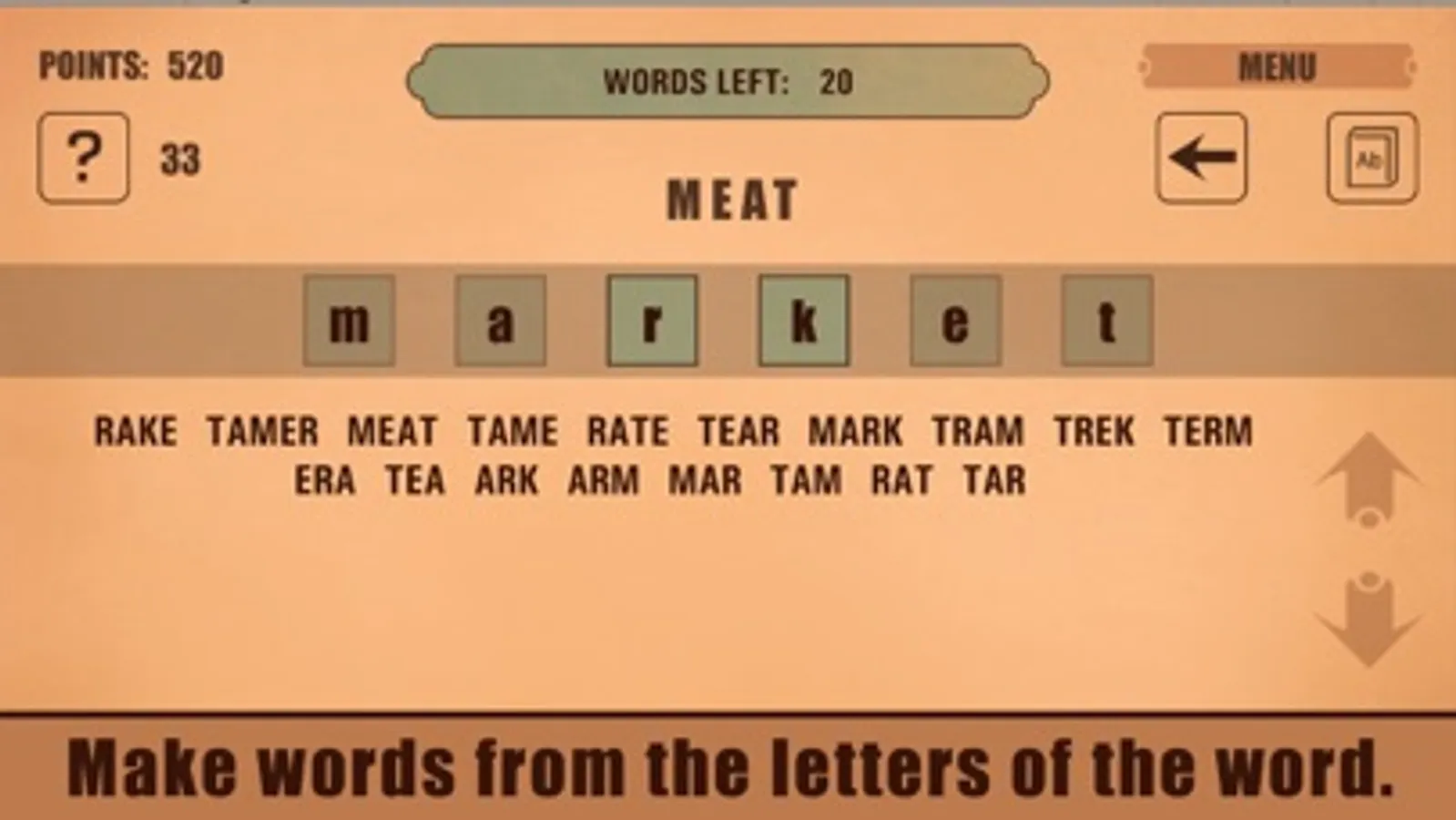 The game consists of levels, each level is a new word. Making words from words, you gain points - each letter made up of words, this one point.