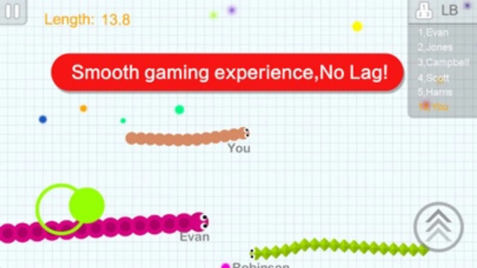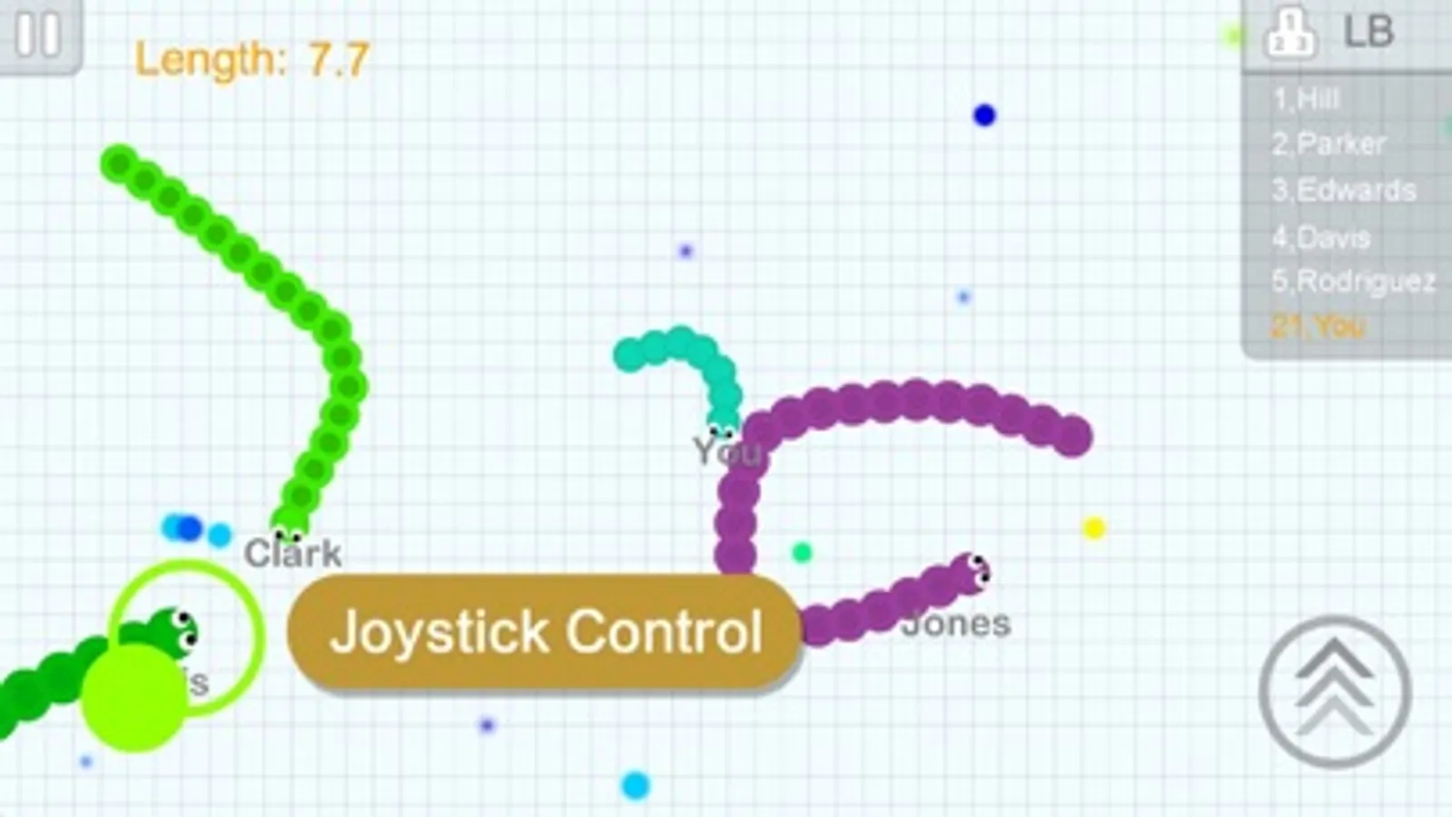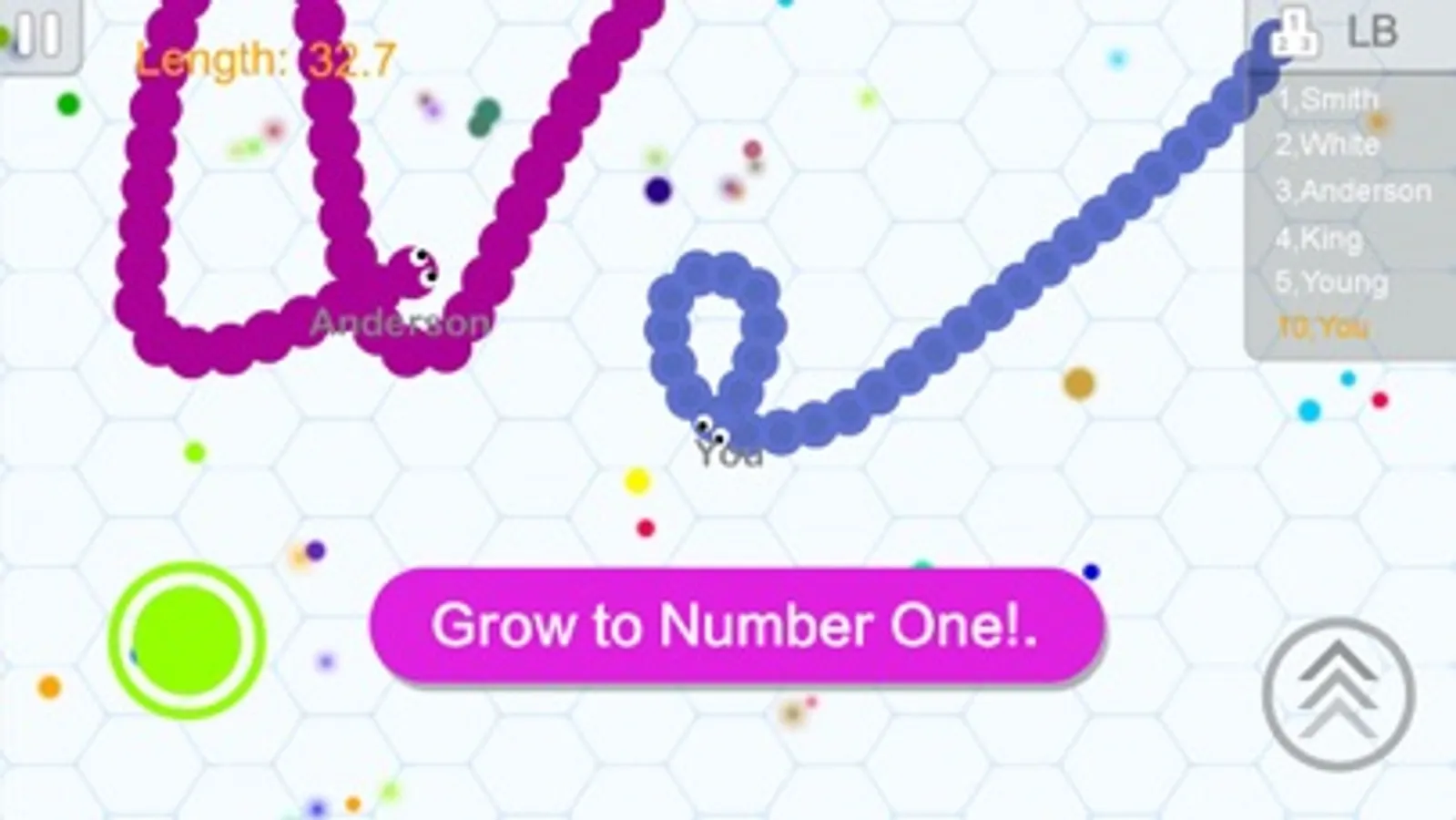 Eating agars will make you longer and bigger. Avoid to hit others snakes with your head.