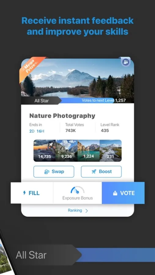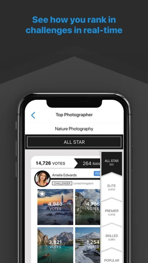 Track your progress in real-time throughout the game. Vote on other players’ photos, collect votes and see how you rank compared to others. Your voting power increases with every level.