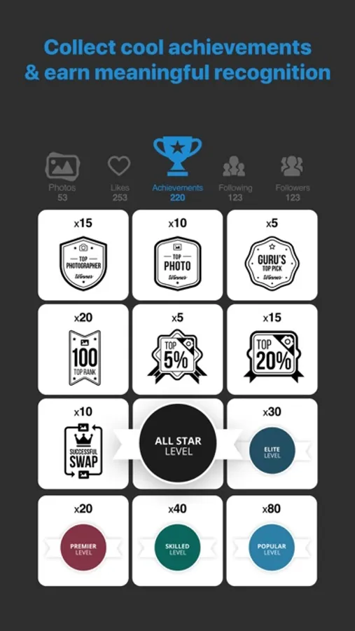 Gain votes on your photos and level up the ranks to achieve the ultimate title of Guru. Experience a new way to share photos.