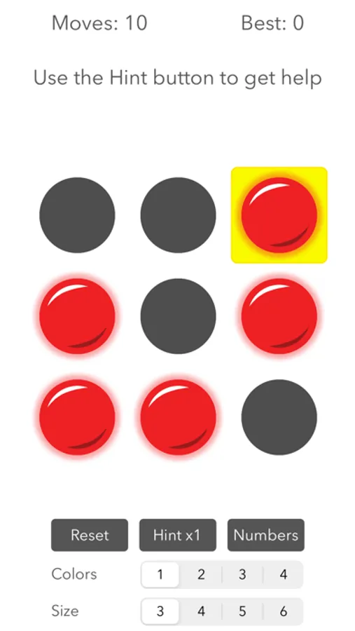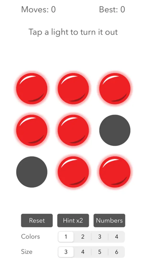 Advanced modes add multiple-colored lights and different grid sizes to allow you to customize the difficulty level. Best scores are tracked for each mode, allowing you to compete against yourself in pursuit of total Lights Out Ultra mastery: can you solve all difficulty modes in less than 20 moves?
