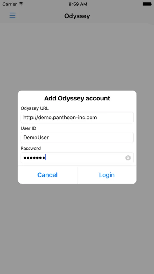 Note! The Odyssey Mobile app only works with the Odyssey Server Platform. This requires customer service agreements with Pantheon to obtain credentials for the Odyssey SAAS Server(s). For on-premises Odyssey Server access contact your organization’s Odyssey Support Team.