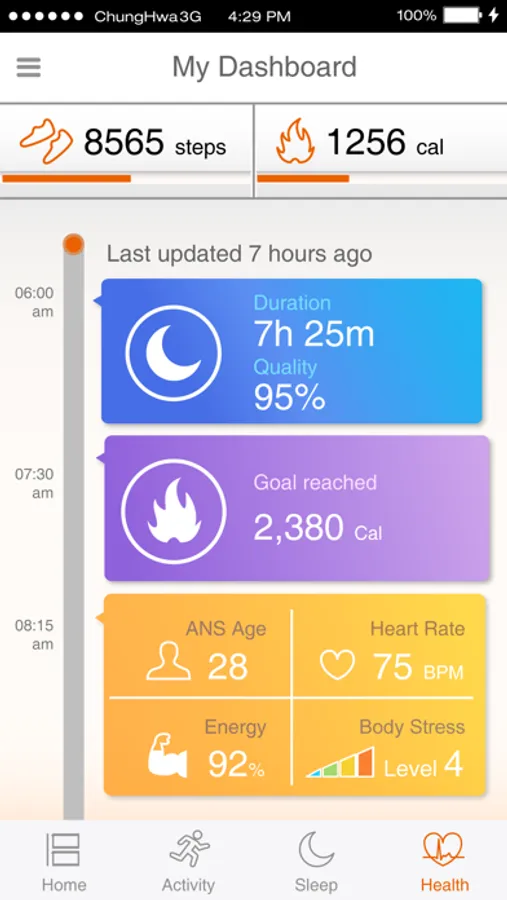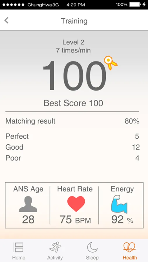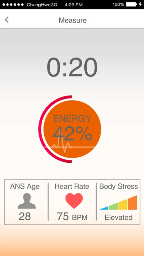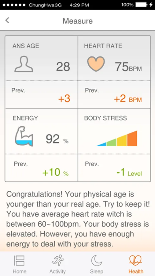 • Calculate your health index via EKG heart rate measurement, showing your heart rate, physiological age, body stress, and energy values.