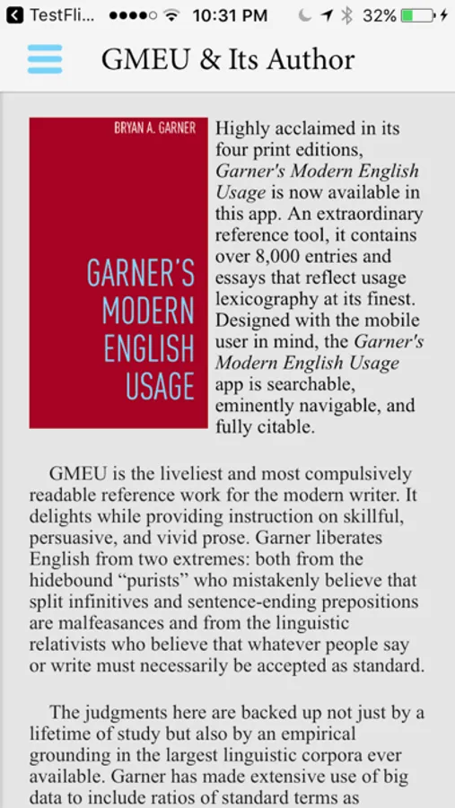 Highly acclaimed in its four print editions, Bryan A. Garner's Garner's Modern English Usage is now available on your iPhone and iPad. This extraordinary reference tool contains over 8,000 entries and essays that reflect usage lexicography at its finest. Designed with the mobile user in mind, Garner's Modern English Usage is searchable, eminently navigable, and fully citable.
