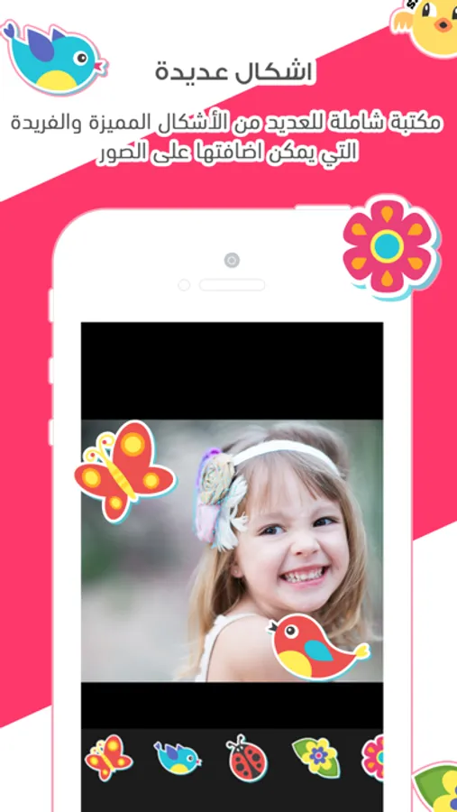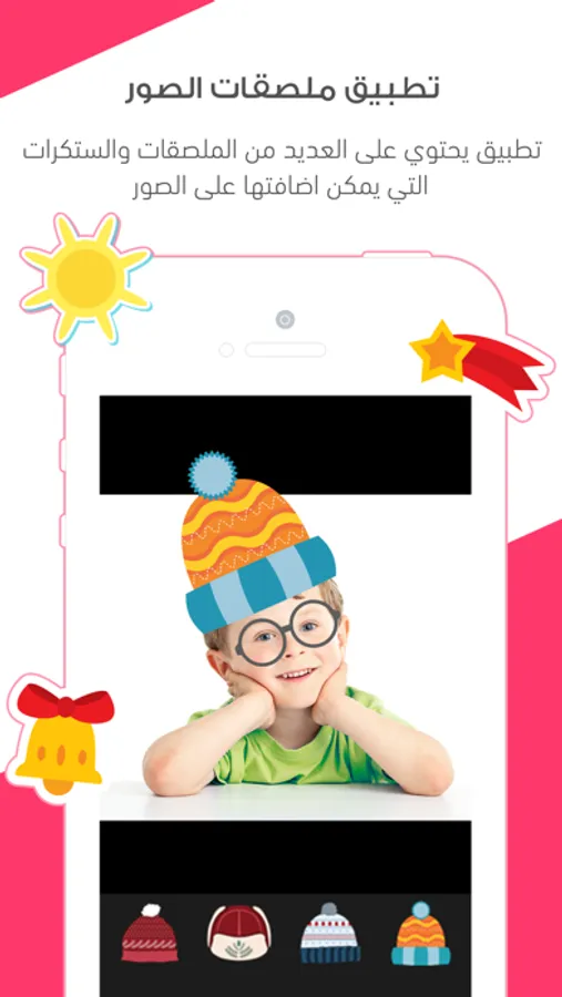 تطبيق يحتوي العديد من الملصقات والأشكال الرائعة التي يمكن اضافتها على الصور وتزيين الصور بها , يمكن اضافة القبعات والنظارات والشوارب واللحية على الصور