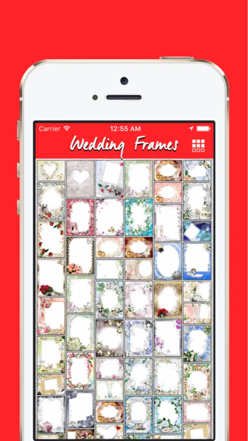 Choose photo from gallery or take new photo with camera, select a frame and generate your wedding photo frames.