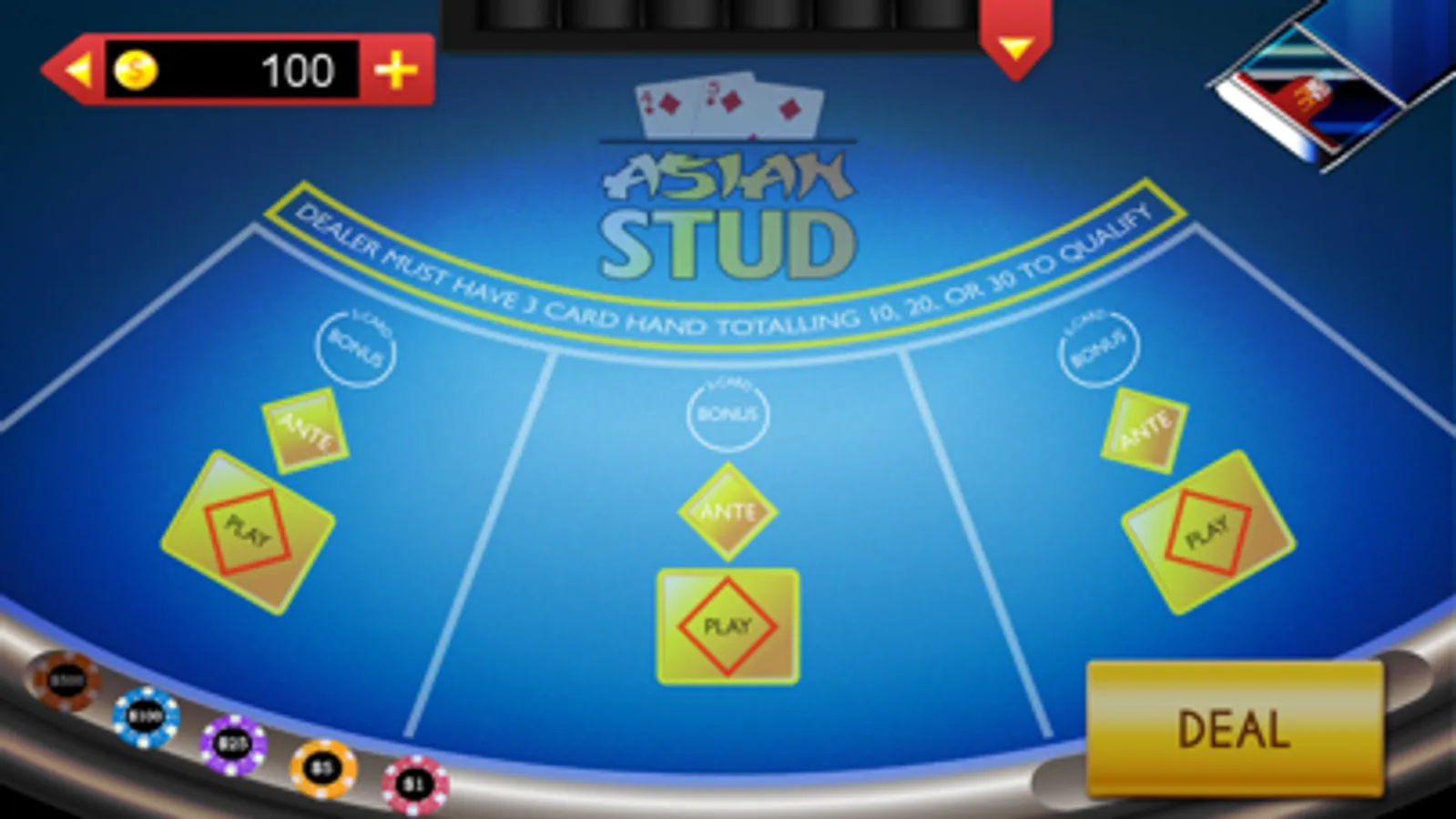 To place a bet, first touch the 'ANTE' betting area circle, then click on the chip denomination. Bonus bet may only be placed after ANTE bet is made. Minimum wager for ANTE bet is $5 and minimum bet for bonus bet is $1.