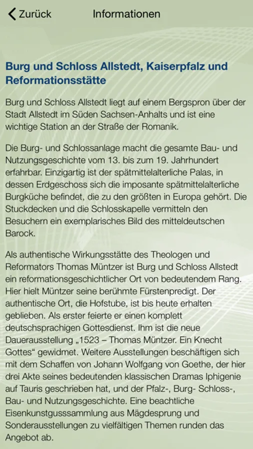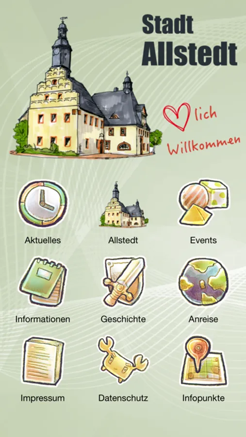 Die Stadt Allstedt mit Ihren Ortsteilen ist reich an Geschichte, Kulturdenkmälern, touristischer Kleinoden in einer vielfältigen landschaftlich Interessanten und sehr waldreichen Gegend, eingebettet in die Goldenen Aue, den Ausläufern des Südharzes und der Querfurter Platte. Nachweise der Besiedlung gehen bis in die Jungsteinzeit (4000-2000 v.u.Z.) zurück. Als Kaiserpfalz erlebte die Stadt Allstedt im 9. Jhdt. bis 13. Jhdt. einen hohen Stellenwert im Deutschen Reich mit zahlreichen Beurkundungen. In der Reformationszeit war Allstedt die Hochburg des Reformators Müntzer. Noch vor Luther hielt er die Messe in deutscher Sprache und lockte tausende Bauern und Bergknappen nach Allstedt.