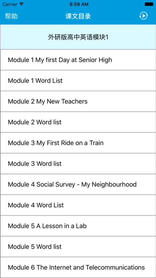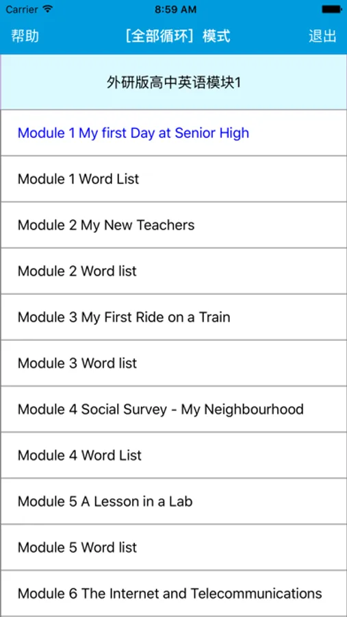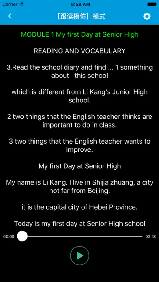 本应用对应外研版高中英语必修1课本,具有跟读模仿,自动听写,变速播放的复读机功能。