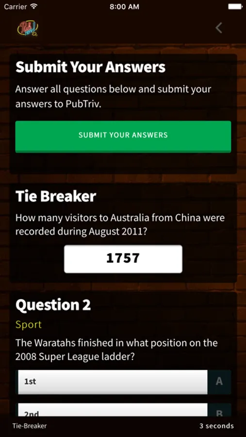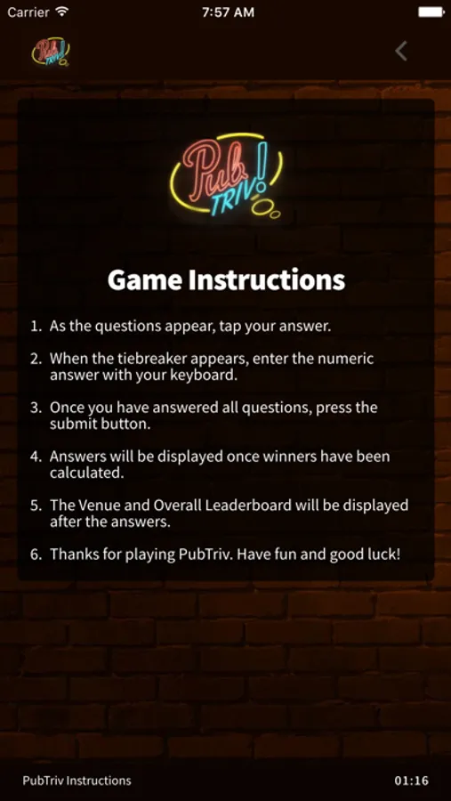 BarTV delivers PubTriv, an interactive trivia game played in venues around Australia. Each game consists of multiple choice questions followed by a tie-breaker question. Patrons enter each game and the entrant with the highest score is the winner. In the event of an equal score, the entrant with an answer closest to the tie-breaker question is the winner. In the event of an equal score and an equal tie-breaker answer, the first entry received by PubTriv will be deemed the winner.