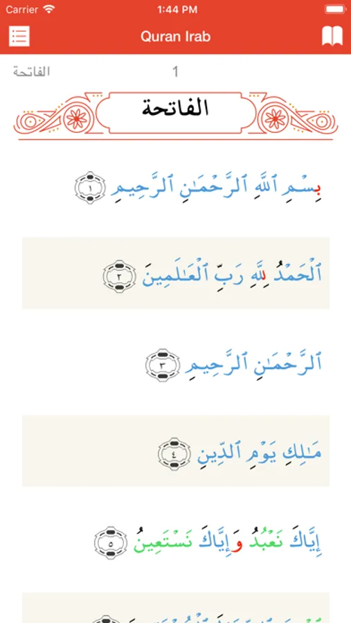 A great way for beginner students of the Quranic language to differentiate the three main types of words. See them in colours: Nouns in blue, verbs in red and particles in green.