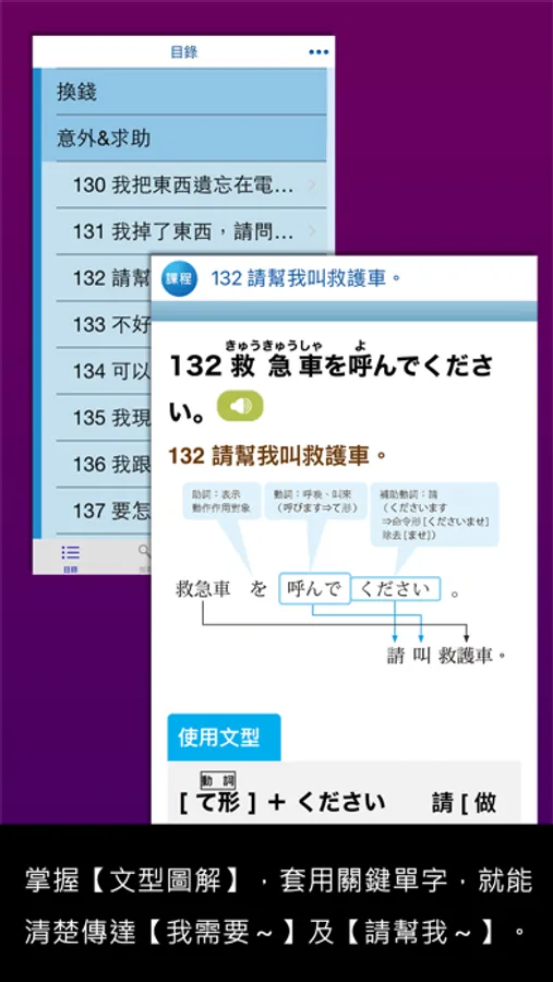 掌握固定文型、並放入關鍵單字,就能清楚傳達【我需要~】及【請幫我~】的念頭。