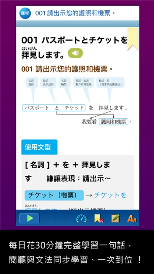 希望每日「花30分鐘完整學習一句話所隱含的規則性文法」,並掌握「適時、適地、適人」的使用時機,達成「深入、完整」的有效學習。